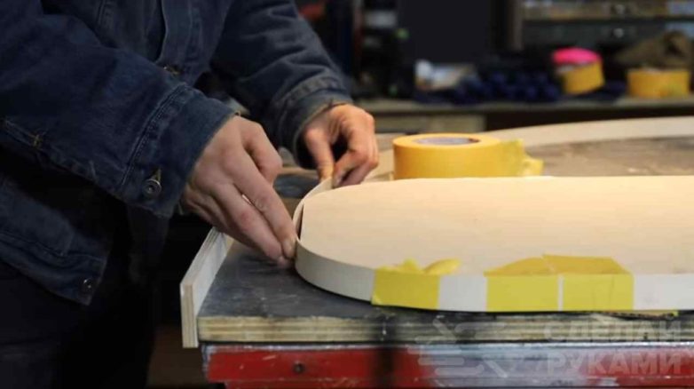 Первым делом определяемся с размерами тумбы. Потом из листа фанеры необходимо будет вырезать основание и верхнюю часть. Кромку фанеры автор обклеивает шпоном.