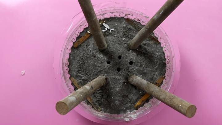Установите черенок от лопаты, разрезанный на несколько частей. Это будут ножки. В центре в растворе сделайте дренажные отверстия.