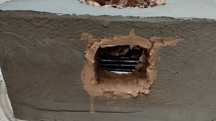 С помощью картона и песка сформируйте отверстие. Продолжайте добавлять цементно-песчаный раствор и битые кирпичи.