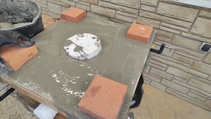 Наконец, после затвердевания вырежьте и уберите пенопласт. Заполните цементно-песчаным раствором мойку (вокруг установите опалубку из досок).