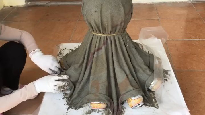 Разведите цемент водой достаточно жидко. Пропитайте ткань в растворе. Повесьте на конструкцию. Сделайте отверстие в ткани по центру.