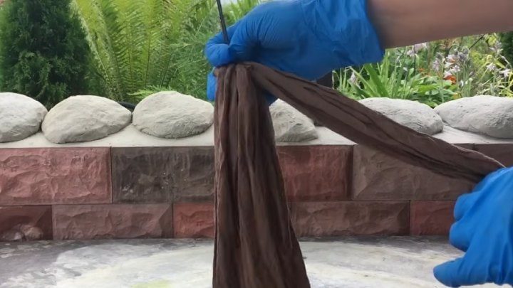 Пропитайте заготовки из чулок и цемента грунтовкой глубокого проникновения. Через несколько часов покрасьте акриловой краской и зафиксируйте результат лаком, с промежуточной просушкой согласно инструкциям на упаковках.