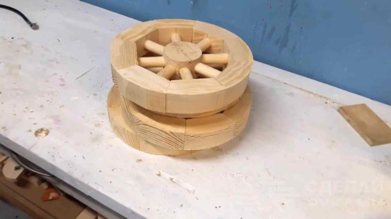 После этого автор приступает к сборке колес. В центральную часть колес вставляем спицы длиной по 7 см, потом надеваем на них восемь деревянных сегментов. Соединения промазываем клеем ПВА.