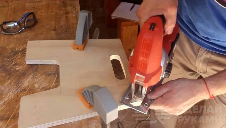 Первым делом необходимо будет напилить заготовки из фанеры и сделать разметку. Чертеж стула нужно сделать заранее. Затем надо вырезать детали детского стульчика. Всего потребуется четыре заготовки: сиденье, спинка и две боковые части.