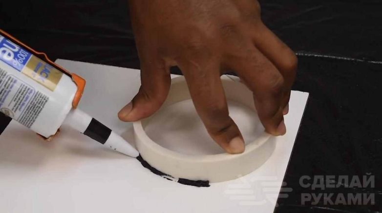 На следующем этапе от пластиковой трубы подходящего диаметра необходимо будет отрезать кольца (шириной примерно 2-3 см). Автор использует их в качестве форм.В пластиковых кольцах надо сделать пропил, а нижнюю часть нужно обклеить скотчем. Устанавливаем формы на ровную поверхность — ламинированное ДВП или ДСП, влагостойкая фанера, плитка. По кругу наносим герметик.