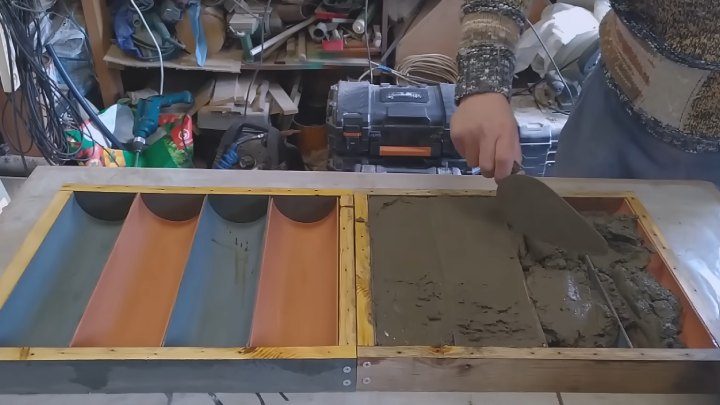 Распилите эти заготовки вдоль на 2 одинаковые части. Из досок и саморезов соберите опалубку. Установите внутрь половинки ПВХ труб, смажьте их маслом. Смешайте раствор из 1 части цемента и 2 частей песка. Выложите в трубы, армируйте. Разровняйте, оставьте на сутки-двое.