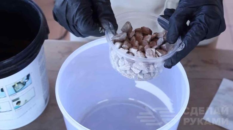 Внутрь автор кладет камни, чтобы емкость не «плавала» в свежем бетоне. Вместо камней можно использовать что-то другое.