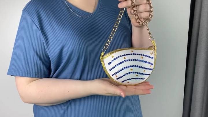 Снова возьмите атласную ленту. Приклейте край, сделав петельку, через которую зафиксируйте фурнитуру — ручку/цепь для сумки.
