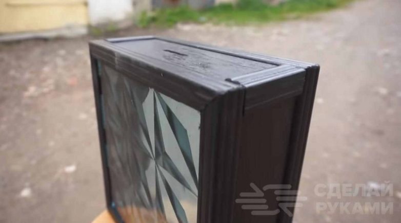 После этого обклеиваем стеклоблок снаружи деревянным уголком и фанерой. Для этого автор использует силикон, однако можно также взять жидкие гвозди или суперклей.