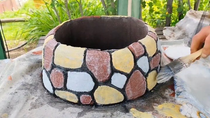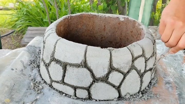Доставайте весь хлам, какой есть на участке (ржавые ведра, тазики, миски), заливайте цементным раствором и творите чудесное украшение своими руками.