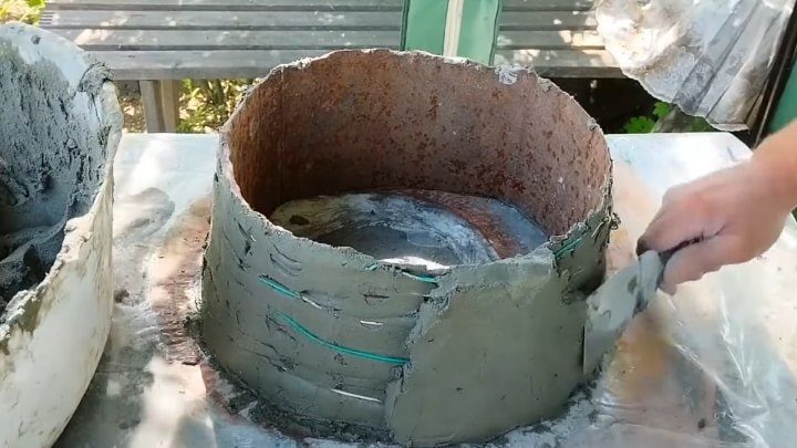 Отрежьте у старого ведра дно. Установите кольцо на рабочую поверхность, прикрытую плёнкой. Разведите цемент с песком 1:2 водой до нужной густоты. Нанесите на стенки. Обмотайте проволокой для армирования.