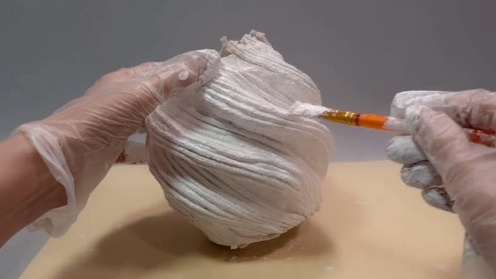 Теперь возьмите бельевую верёвку. Нарежьте на кусочки по длине волн, приклейте на каждую выступающую часть. Сверху покройте смесью из монтажного клея и акриловой краски 1:1.