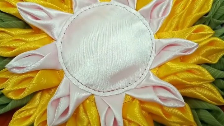 Когда дойдёте до середины, дальше лоскутки уже неудобно пришивать. Можно поступить следующим образом: добавить круг из ткани и оформить его под какую-нибудь фигуру.