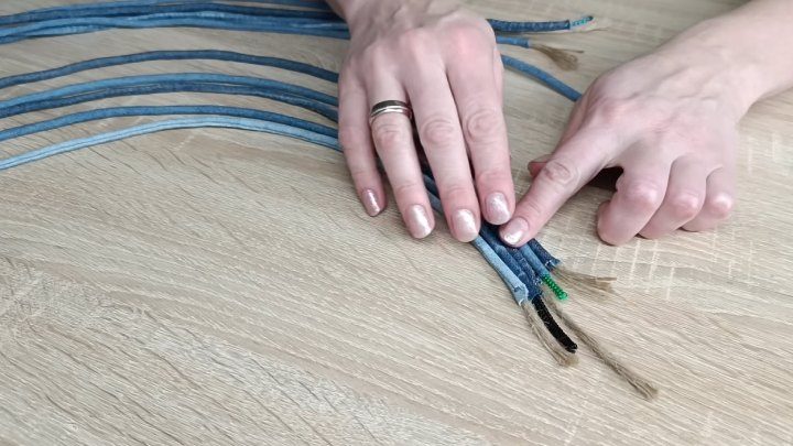 Вставьте внутрь каждой полосы шнур. Совместите столько полос в ряд, сколько посчитаете нужным. Сшейте сбоку всё вместе несколькими ручными швами.