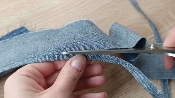 Разрежьте джинсы так, чтобы раскрыть штанину. Вырежьте боковые швы. Сверните край полотна буквально на 0,5 см лицевой стороной внутрь. Проложите строчку на машинке (плотный зигзаг). Срежьте по краю уже обработанную полосу!