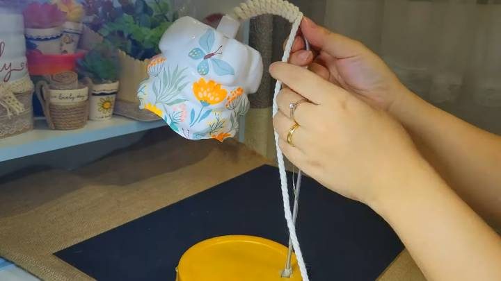 Соедините пластиковую часть с проволокой. Обмотайте гирлянду вокруг неё. Закройте проволоку канатом/толстой пряжей.