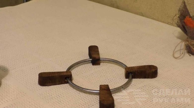 После этого мастер обжигает деревянные «лепестки» газовой горелкой и зачищает щеткой. Затем в заготовках необходимо просверлить сквозные отверстия по диаметру стального прутка. «Лепестки» надеваются на кольцо, и самоделка готова.