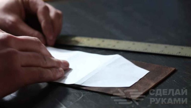 Сначала необходимо подготовить кусок кожи прямоугольной формы, подходящий по размеру. Затем нужно будет отрезать все лишнее, используя за образец бумажный шаблон. Какую использовать кожу — на ваше усмотрение.