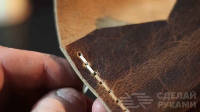 В домашних условиях можно обойтись и шилом. Однако потребуется сделать разметку, чтобы ниточный шов был ровным, а не вилял в разные стороны. По линии отверстий нужно снять слой кожи, чтобы нитка не выступала «буграми».