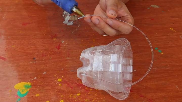 Наконец, из оставшегося пластика вырежьте длинную полоску. Приклейте — это будет ручка.