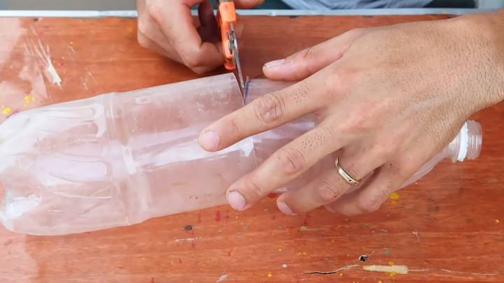 Наденьте его поверх нижней части с дном. Теперь возьмите ножницы и сделайте надрезы на пластике до этого кольца.
