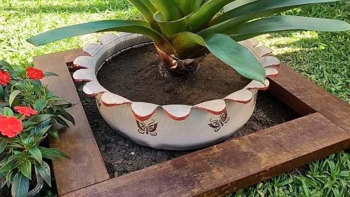 Следующий шаг — покраска. Здесь можно поэкспериментировать с трафаретами и придать покрышке необыкновенный вид Наконец, покройте её лаком снаружи. Установите на постоянное место в саду. Наполните грунтом и высадите растение.