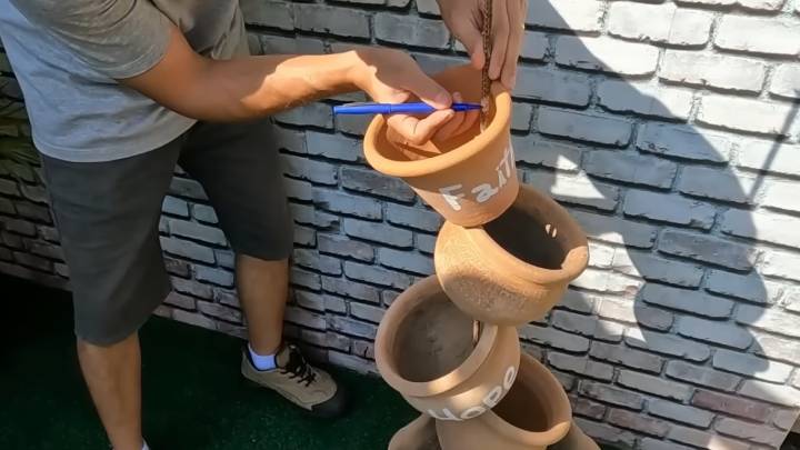 Теперь наденьте остальные керамические горшки на арматуру. По необходимости декорируйте их акриловой краской и/или верёвкой.