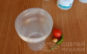 В качестве «подопытных кроликов» в этом эксперименте будем использовать перец, помидор и репчатый лук. Форма для заливки полимерной эпоксидной смолы — обычный пластиковый стакан емкостью 500 мл (в принципе, можно использовать и другую тару, какая найдется под рукой).