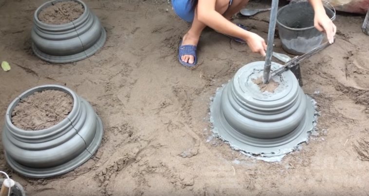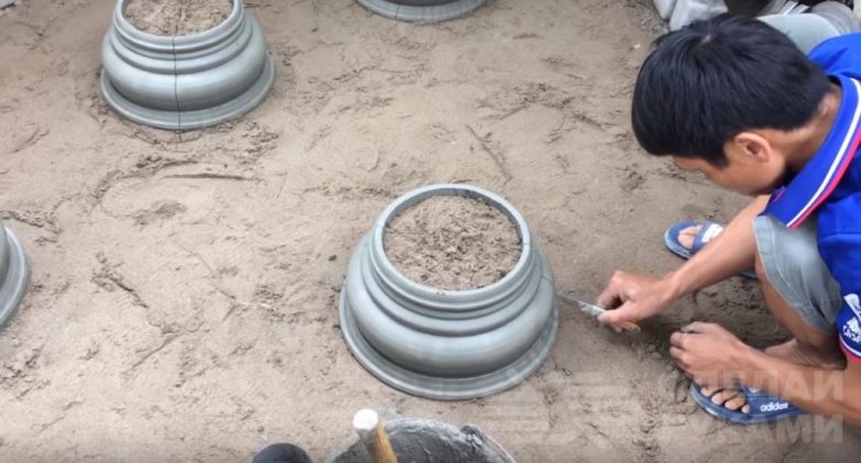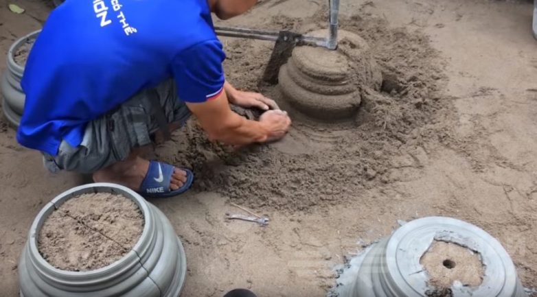 Плотно воткнув трубу в землю, определитесь с высотой и размером постамента. Отняв несколько сантиметров на толщину изделия, сформируйте из песка основу.