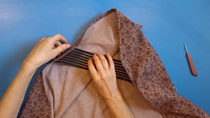 Теперь займитесь обработкой вырезанных квадратов. Сложите их по диагонали, вставьте кромку/тесьму по центру, проложите строчки и закрепите прямым швом.