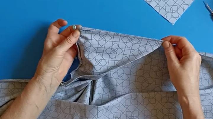 Сложите вырезанные углы на ткани. Прострочите на машинке.