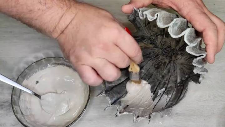 Положите на воздушный шарик. Сформируйте аккуратные складки. Оставьте в таком виде, пока цемент не застынет. Затем укрепите серединку с помощью проволоки. Замажьте сверху и по стенкам более густым раствором цемента. Оставьте просушиться.