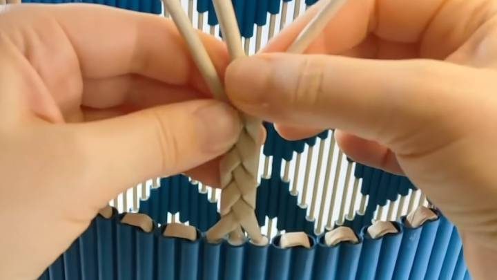 Из оставшихся тонких трубочек сплетите косички. Вставьте, приклейте и закрепите. Сверху оберните пряжей, например. Это будут ручки изделия.