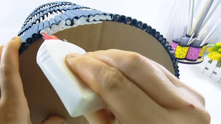 Подровняйте и поставьте на ребро. Склейте край ПВА. Тонкие трубочки будут выступать сверху — так и нужно.