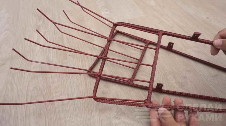 Далее из отрезков арматуры мастер делает две П-образные заготовки. Потом к ним нужно приварить по одной перемычке из арматуры и подготовленные стальные прутки.