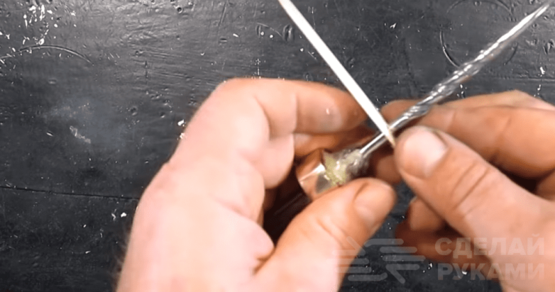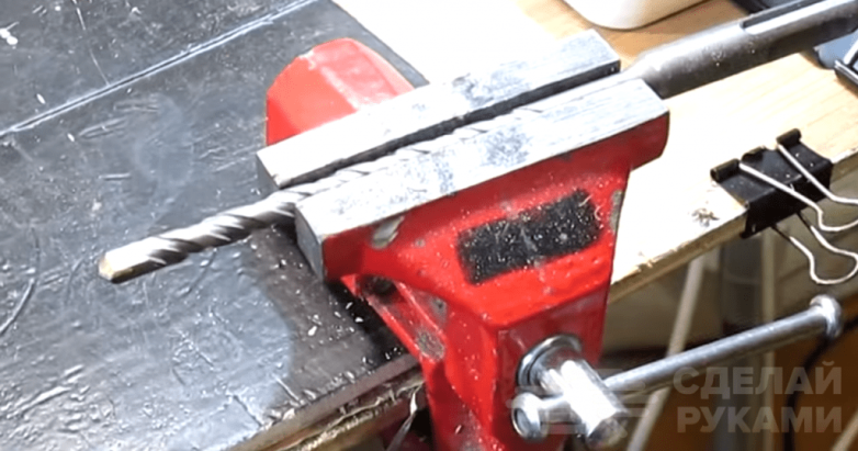 Наполнителем для эпоксидной смолы будет порошок из пробки. Затем берем сверло по бетону, зажимаем в тисках и отрезаем наконечник. Аккуратно стачиваем для придания необходимой формы, периодически опускаем в воду для охлаждения. Иначе при перегреве сверло потеряет закалку.