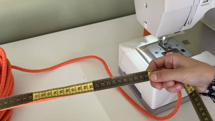Теперь перейдём к следующей детали — это дно, соединённое с ручками. Отмерьте 70 см шнура. Сложите пополам, сшейте дно 5 см.