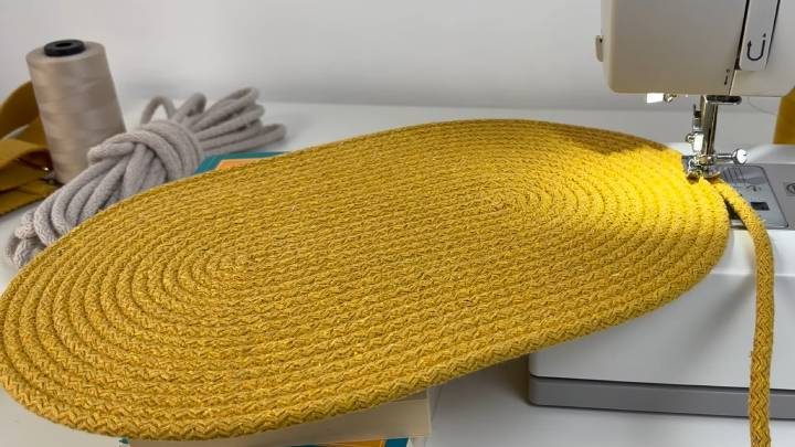 Продолжайте шить, пока не получите овал 38*24 см. Отрежьте шнур, выньте немного сердечник, укоротите. Сделайте закрепку на машинке.