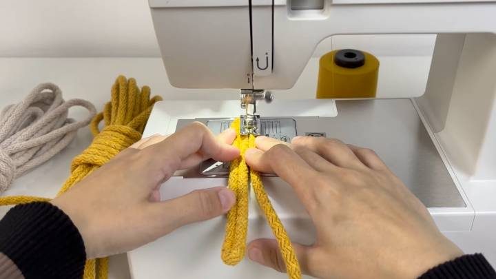 Выньте сердечник шнура на 0,5 см, обрежьте. Отмерьте 14 см, загните шнур. Начните сшивать по кругу на машинке. Используйте зигзаг.
