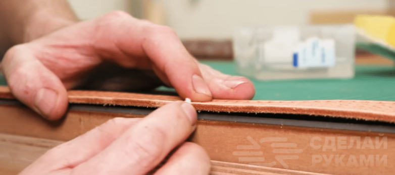 Можно приступать к тиснению. Смачиваем изделие водой и при помощи штампа для гравировки и киянки набиваем рисунок. Когда с тиснением покончено, снимаем фаску с края торцбилом. После чего обрабатываем смесью для затирания торцов и полируем сликером.