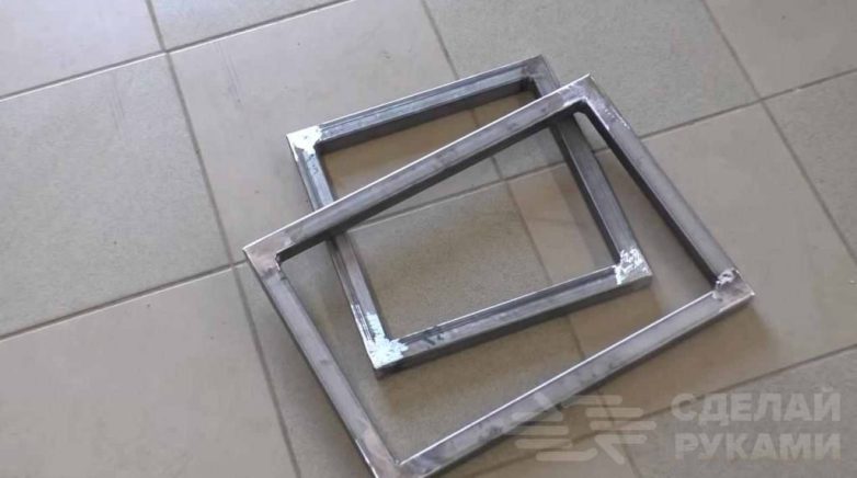 Получившиеся две рамки (квадратную и прямоугольную) надо приварить к двум длинным отрезкам профиля. Готовый каркас потом нужно зачистить болгаркой и покрасить.