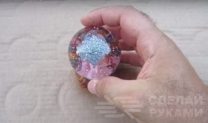 Насыпаем внутрь стеклянного корпуса немного разноцветных звездочек и серебристых блесток, после чего приклеиваем на термоклей пластиковую пробку с игрушкой. Место стыка необходимо дополнительно проклеить суперклеем («Момент» или др.).