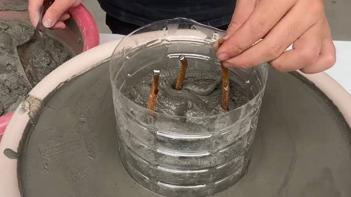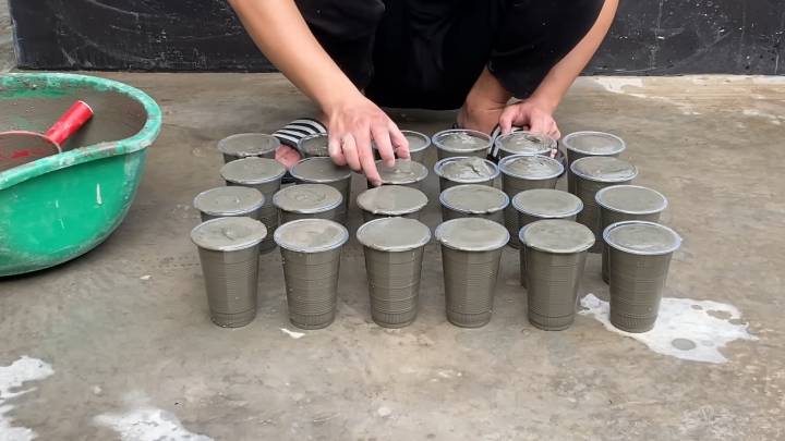 Возьмите несколько одноразовых пластиковых стаканчиков, а также соедините песок и цемент, чтобы сделать базовый раствор. Идея настолько необычная, что сразу же привлекает к себе внимание! Сразу же хочется её повторить.
