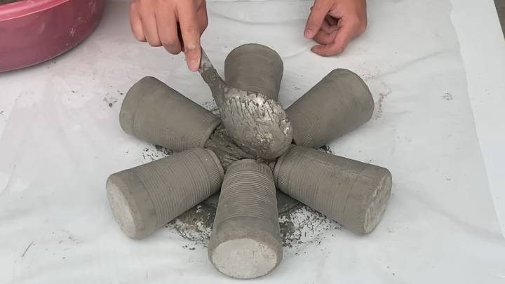 Достаньте заготовки из пластиковых стаканчиков. Таз смажьте маслом (можно — отработанным машинным). Расставьте цементные заготовки из стаканчиков в таз по кругу. Засыпьте влажным песком так, чтобы детали немного выглядывали.