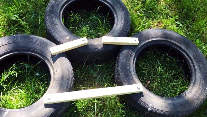 На земле необходимо разложить покрышки треугольником, при этом нижние две должны быть на небольшом расстоянии друг от друга.