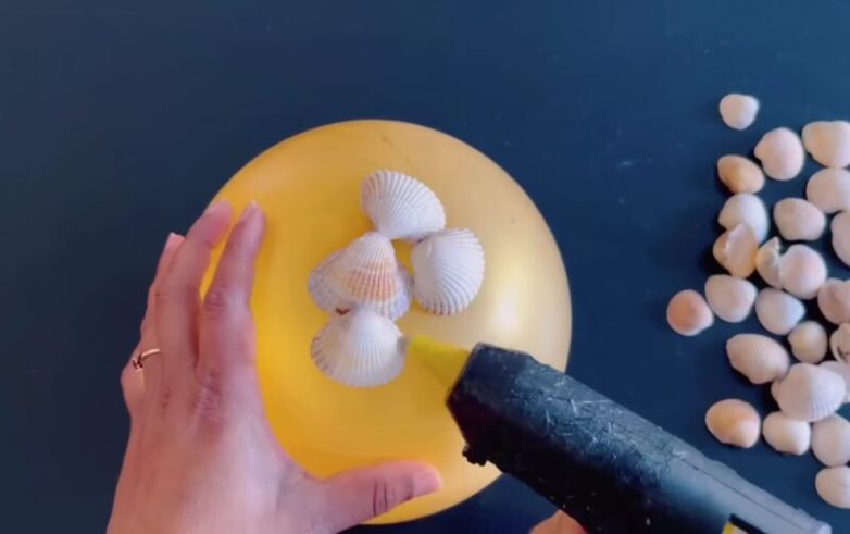 Начните обклеивать шарик ракушками. Первую ракушку закрепите на самой плотной части шарика, далее клей наносите только на сами ракушки. Работайте аккуратно, чтобы шарик не лопнул.