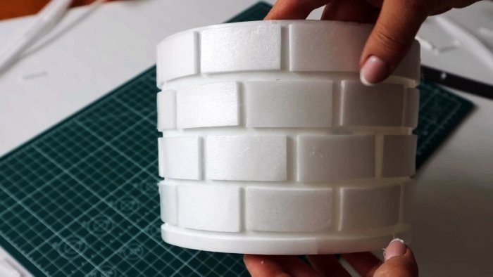 Донные части мягких одноразовых контейнеров разрезаем на полоски одинаковой ширины, которые делим на кирпичики длиной 5 см и приклеиваем горячим клеем к боковой поверхности ведерка в шахматном порядке по окружности рядами сверху донизу.