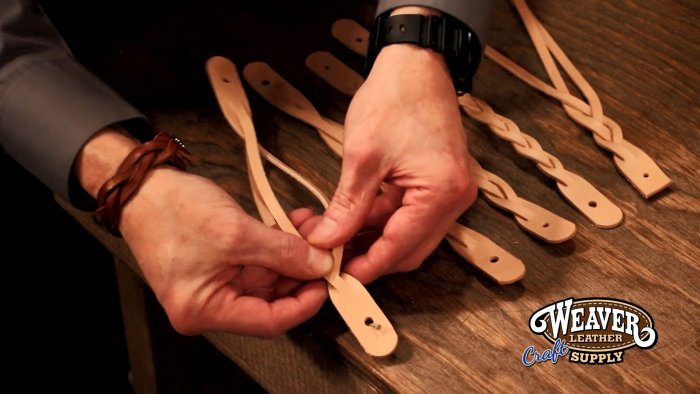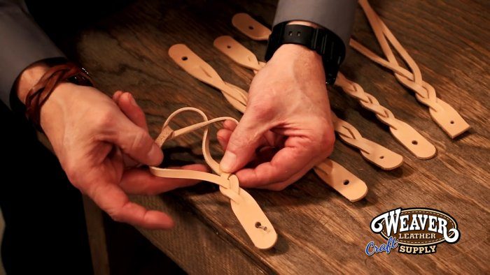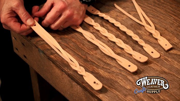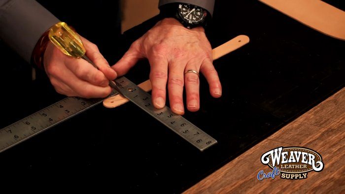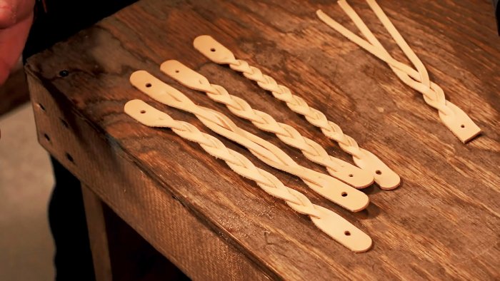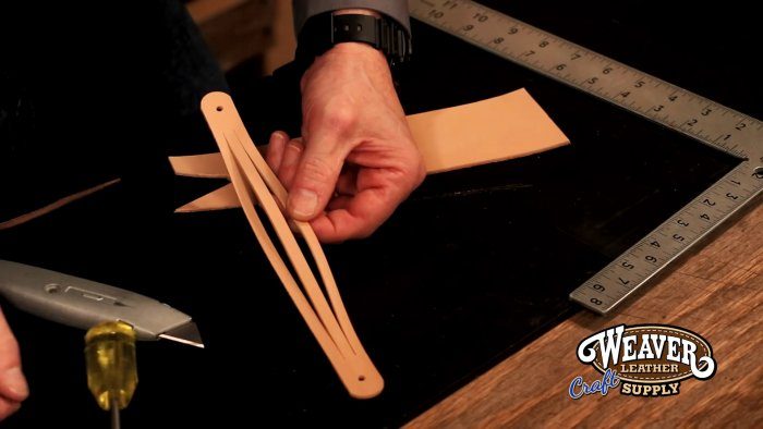 Теперь нужно прорубить отверстия под фурнитуру. Для этого используется тонкая трубка с обточенным краем. После этого с отступом от отверстий под фурнитуру заготовка распускается вдоль на 3 одинаковые по ширине полосы. Она режется ножом под линейку. Чтобы последняя прилегала плотно, под ее выступающую часть лучше подложить кусок кожи.