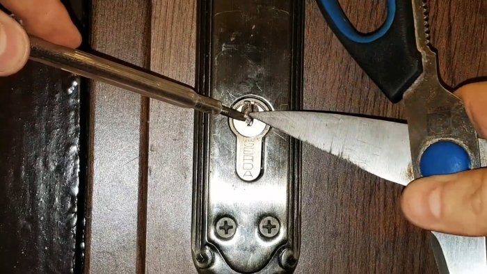 Если нужно просто вынуть из личинки замка обломок, достаточно найти две отвертки, пару ножей или ножниц. С помощью нехитрого инструмента с двух сторон зажимаем выступающий обломок, и упираясь в личинку как рычагами пытаемся по немного его вытаскивать.
