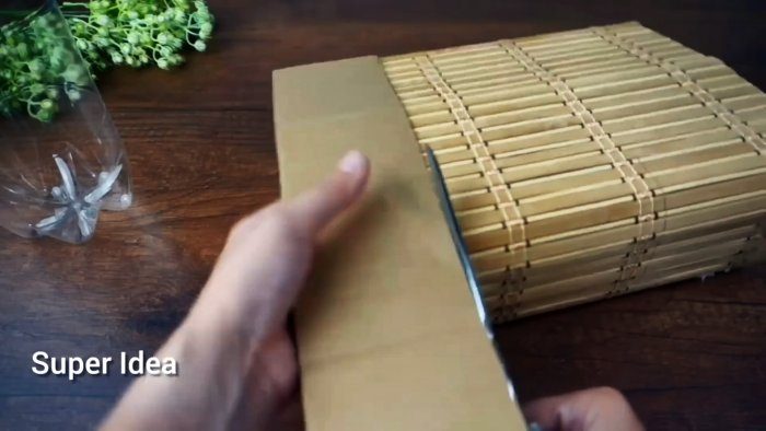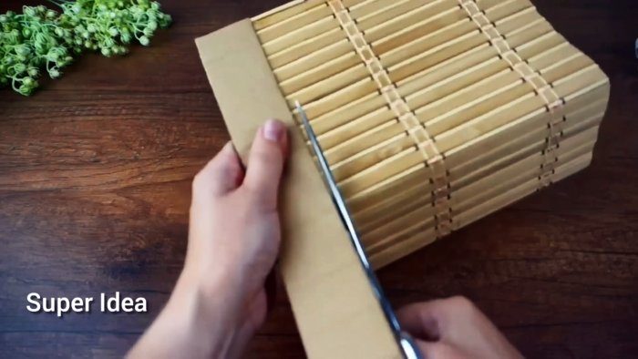 В качестве декоративной отделки возьмём циновку из соломки. Приклеиваем её к картону, используя термоклей. Лишняя часть циновки отрезается.
